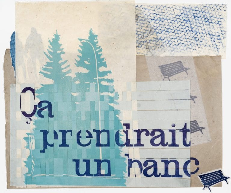 Ma pratique artistique porte sur le corps (mon corps), la domesticité et l’environnement que j’habite. Je puise dans mon intimité pour aborder le fait social. Pour Traces urbaines, j’ai produit deux œuvres issues de mes efforts pour rendre intime ce quartier que je ne connaissais pas. Je suis partie à la rencontre du Vieux-Longueuil et de ses résidents : je me suis vêtue d’une pancarte sur laquelle était inscrit « artiste au travail, veuillez déranger s.v.p. » et « Parlez-moi de votre quartier »; j’ai récolté des affiches sur des poteaux, fait des frottages pour capturer des textures intéressantes et échangé avec des résidents du quartier. On m’a parlé du quartier avec enthousiasme, les résidents y sont attachés. Les cafés, les services, les parcs, “Toutte se fait à pied”, m’a-t-on dit et redit. Quelqu’un m’a aussi parlé du banc manquant à un coin de rue. Lorsqu’ils promènent leurs chiens, les marcheurs se rassemblent là, les chiens se couchent et jouent autour et les humains jasent, ”Ça prendrait un banc”.