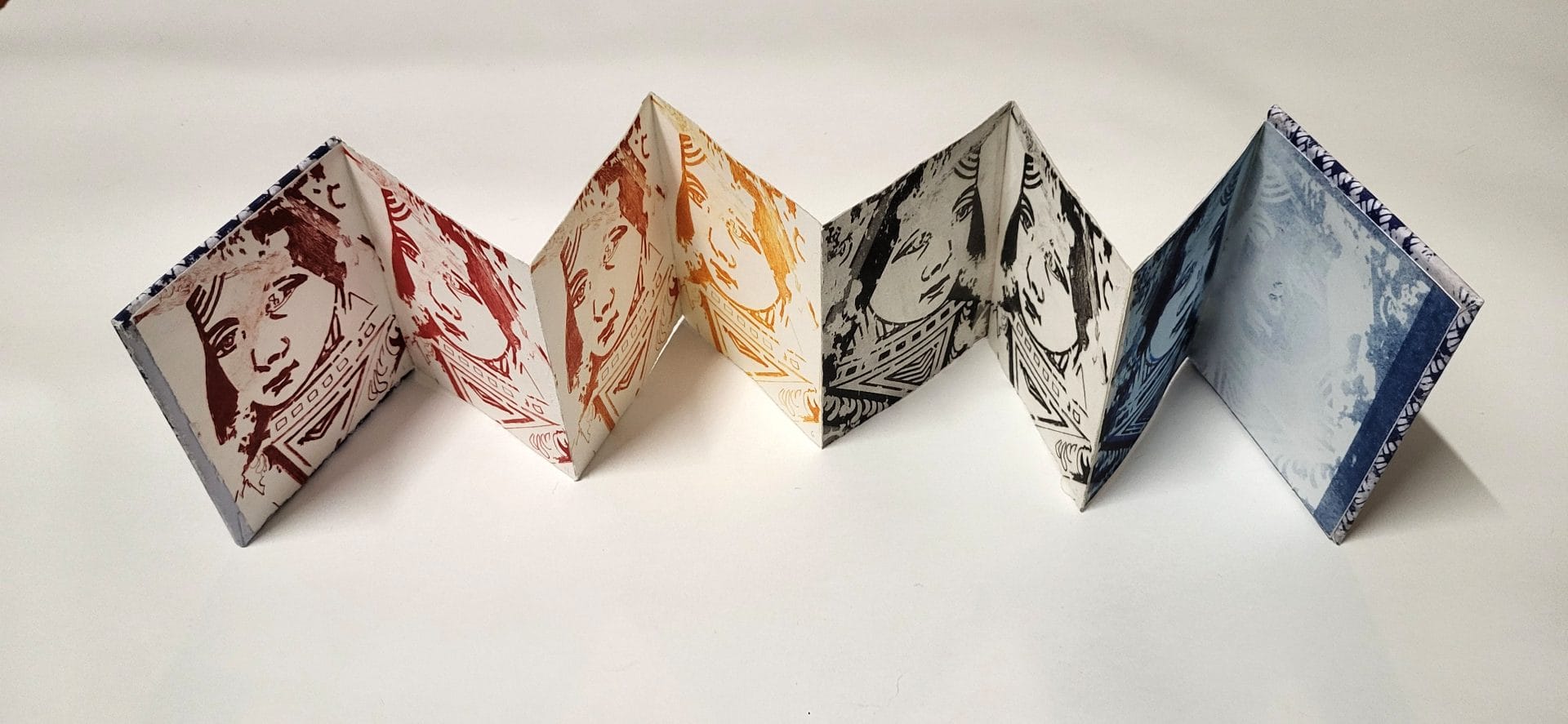 Prototype d’une reliure accordéon avec figure d’une dame de carreau. Gravure sur plexis, photopolymère, cyanotype sur papier Somerset. Couverture : impression numérique sur papier Arche. 81,25 cm x 13 cm